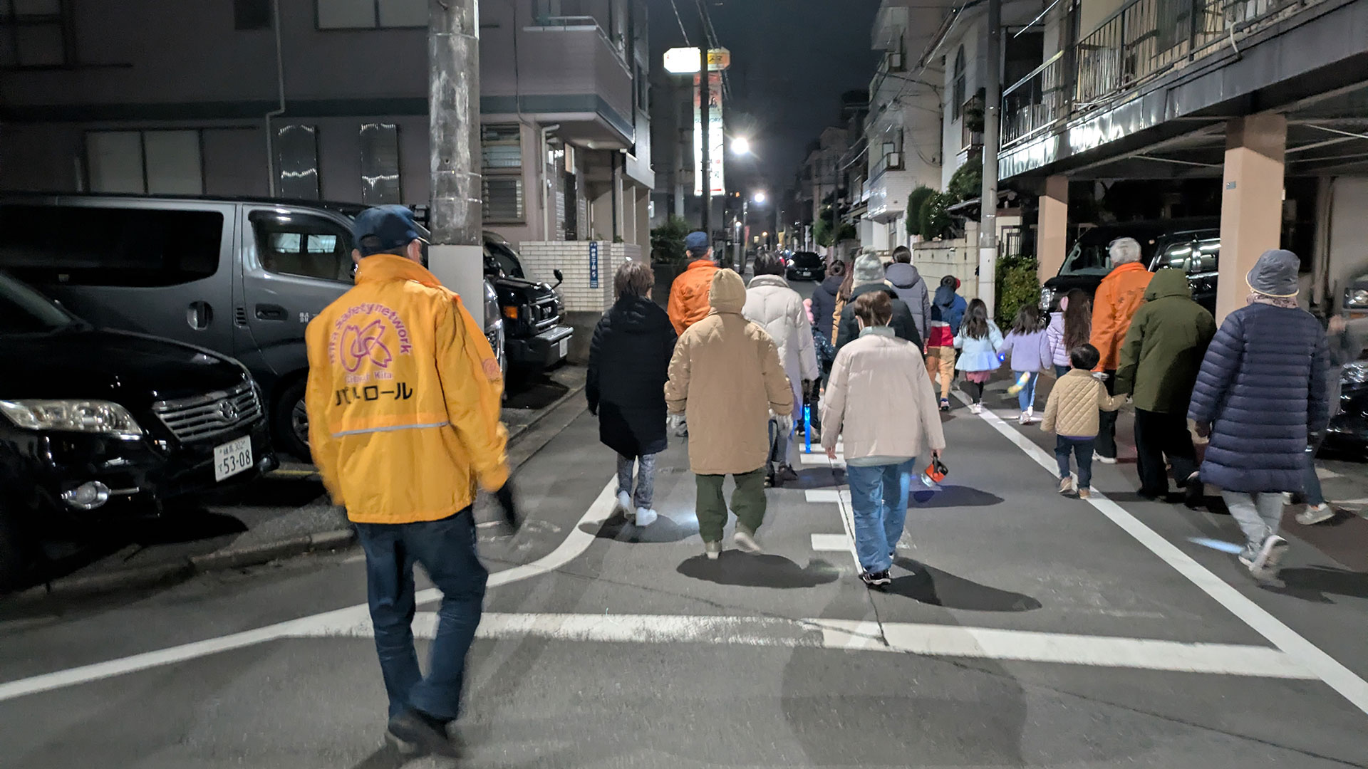 地域の安全を守るため、 夜間に町内を巡回し、防犯・防災の確認を行っています。 住民同士の声かけも、大切な防災活動の一つです。