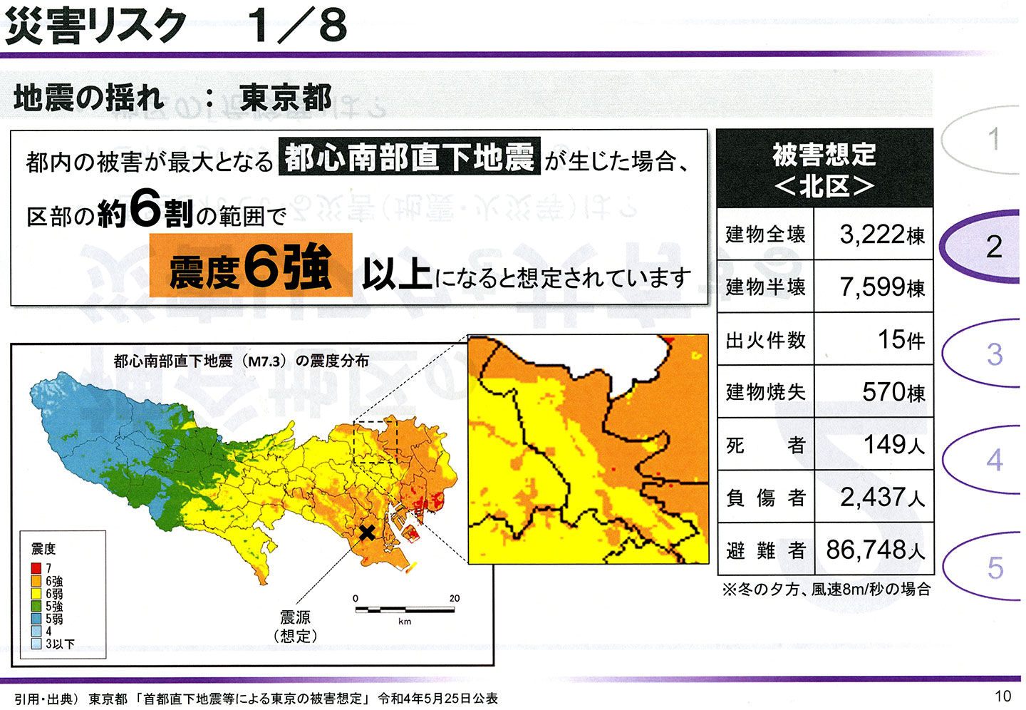 神谷地区では地震の揺れは震度6強とされています。 南町会ではおおむね液状化の可能性が低い地域とされています。 また神谷地区は木造住宅密集地域には指定されていません。